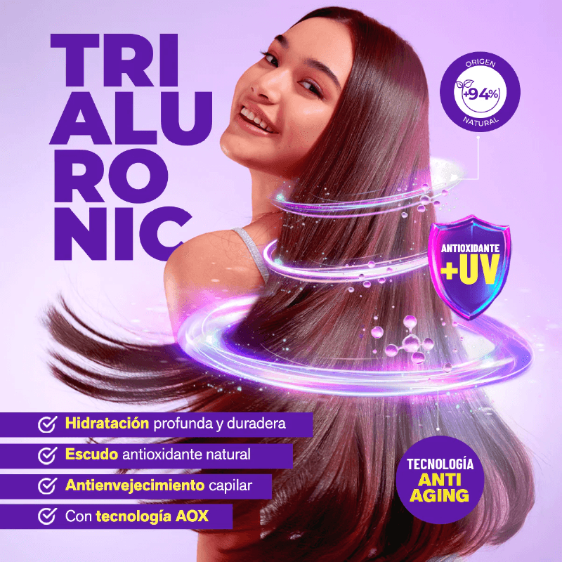 ¿Alguna vez has pensado en la edad de tu cabello? El envejecimiento capilar es causado por el paso del tiempo, la oxidación, los procesos quimicos y factores ambientales que alteran el color, la estructura y la vitalidad. TRIALURONIC es una innovadora combinación de TRES TAMAÑOS DE ACIDO HIALURONICO que actúa en las distintas capas del cabello hidratandolo profundamente y fortaleciendolo. El poder antioxidante AOX de su técnologia BECA, aporta una exclusiva combinación de Bioesters vegetales enriquecido con Romero, curcuma y Té verde, que equilibran los lipidos naturales del cabello, facilitando una mejor absorción de los activos protrgiendo la fibra capilar del envejecimiento prematuro del cabello manteniendo la intensidad del color natural y protegiendolo del estrés oxidativo.